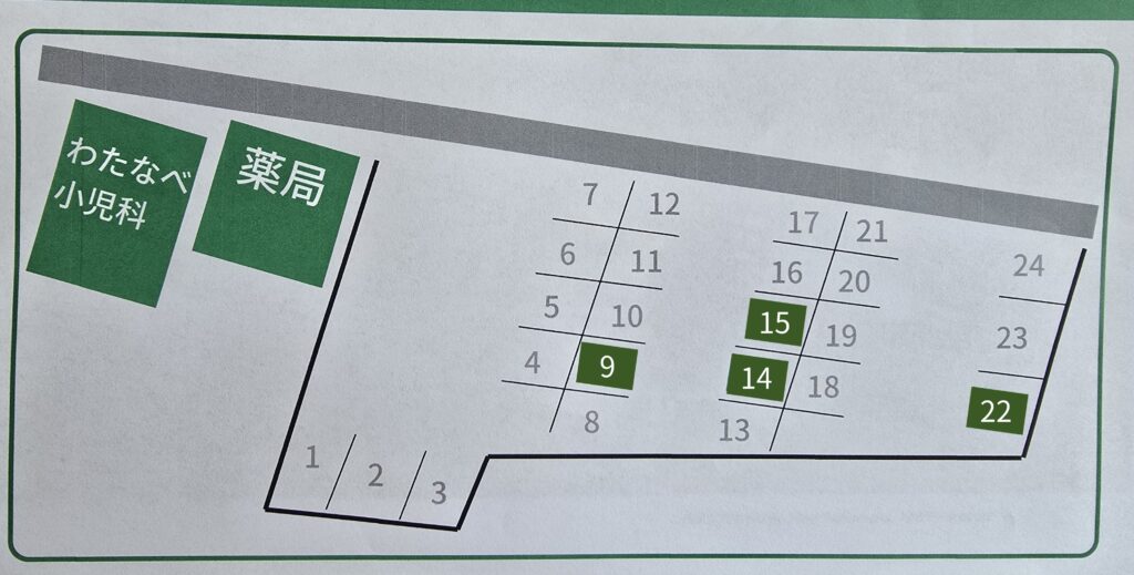 ウイン薬局様の隣にある「昭和町駐車場」のNo.9、No.14、No.15、No.22に停められます。